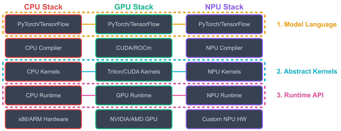 NPU hardware has arrived, but there is a software compatibility gap that is blocking broad migration. Software that can give the best efficiency for each NPU is an essential part of the solution, but efficiency is not enough. Each NPU software stack needs to be compatible with other software stacks at three compatibility points: model language, abstract kernel language and runtime API. More importantly, each NPU needs to be compatible with GPUs at the same three points.